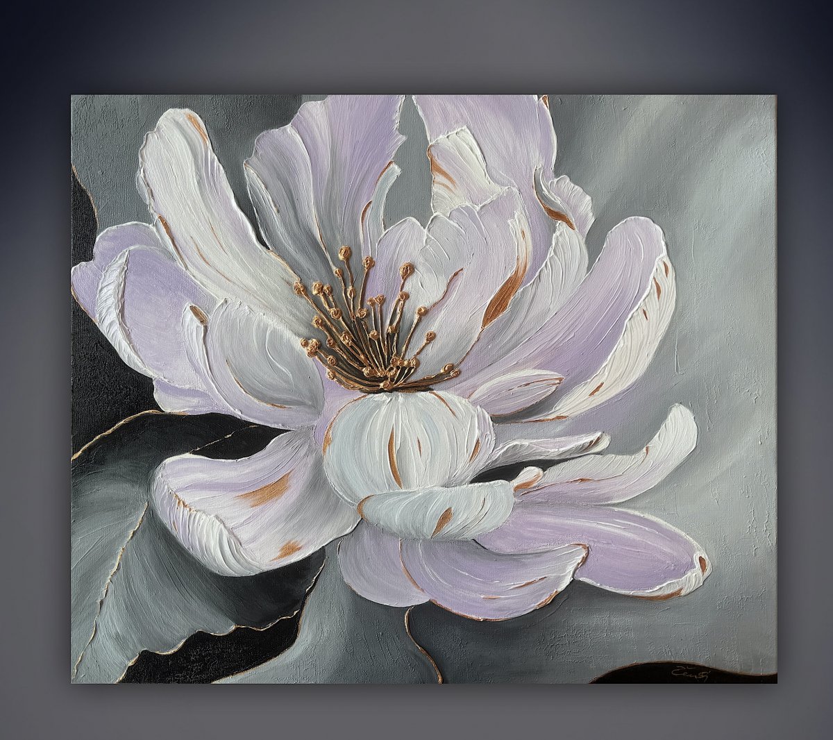 Tento moderní abstraktní obraz květu je vytvořen akrylovými barvami a 3D texturovací pastou, která dodává malbě hloubku a luxusní efekt.