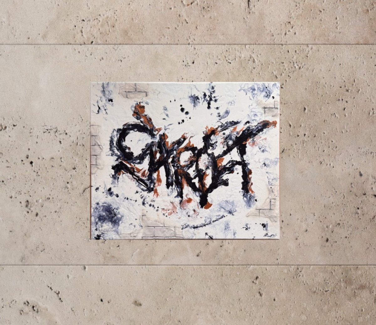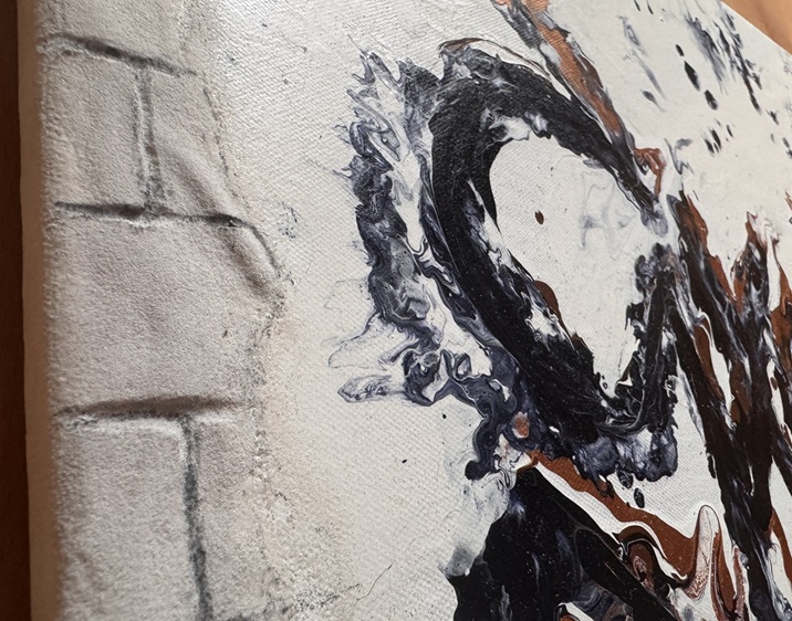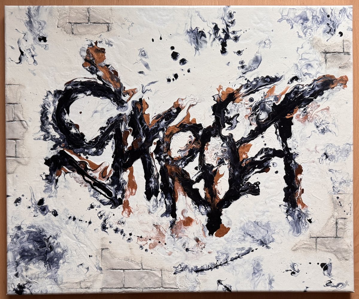 Originální kombinace street-artu a abstraktní malby technikou pouring. Na první pohled evokuje graffiti, expresivně, výbušně, s dynamikou připomínající sprej na stěně.