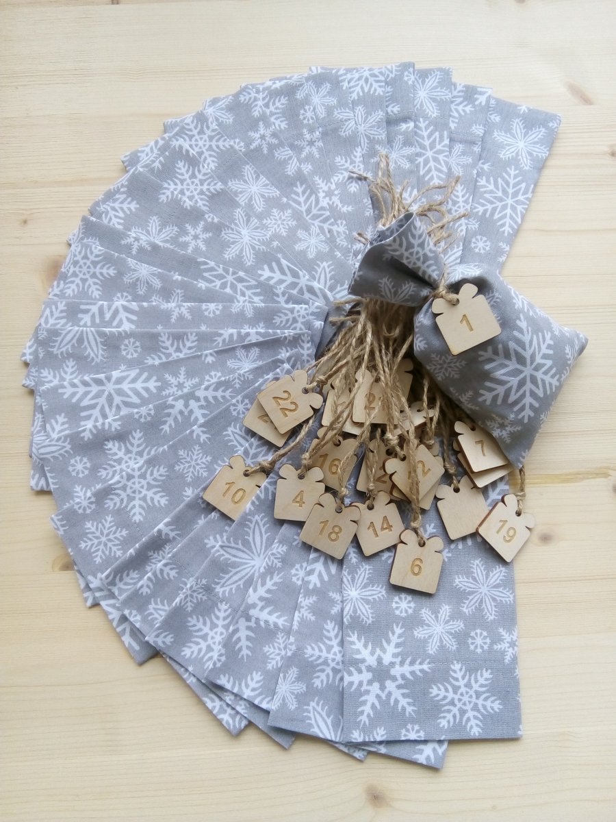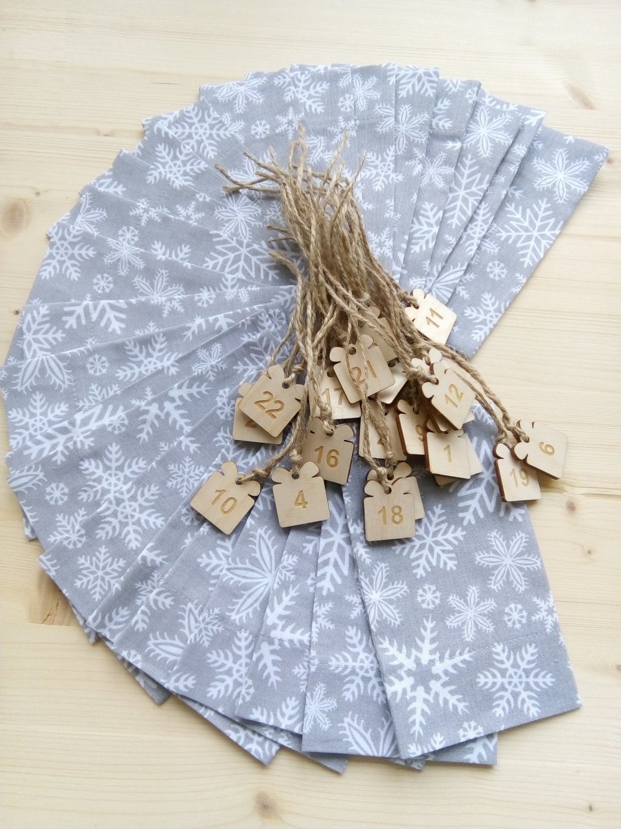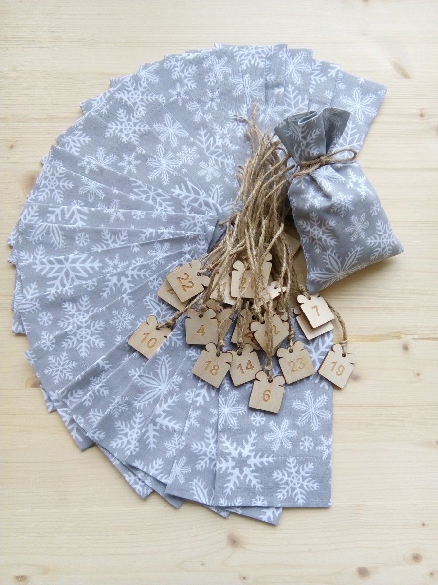 Adventní kalendář obsahuje: 24 kusů bavlněných pytlíčků, 24 ks dřevěných čísel ve tvaru dárečků provlečených jutovým provázkem.
