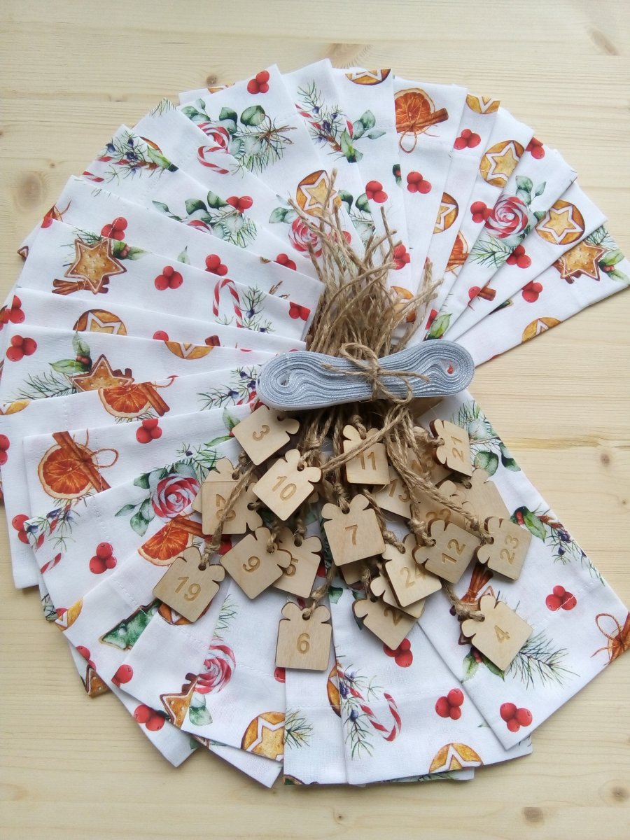 Adventní kalendář obsahuje: 24 kusů bavlněných pytlíčků, 24 ks dřevěných čísel ve tvaru dárečků provlečených jutovým provázkem a taftová stuha s lurexem.
