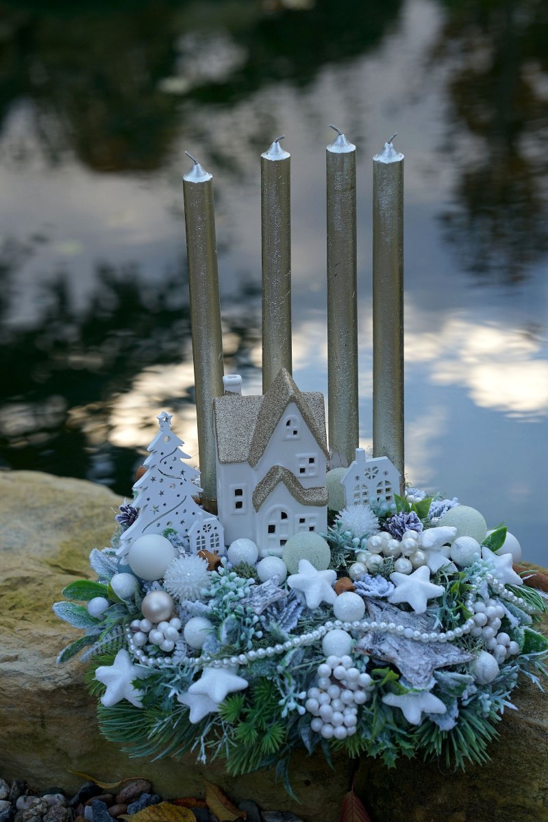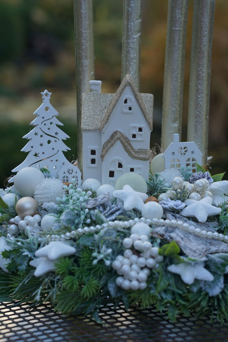 Elegantní advenení svícen z umělého kvalitního chvoji, s domečkem. V nabídce najdete ručně vyráběný stromeček ve stejném stylu.