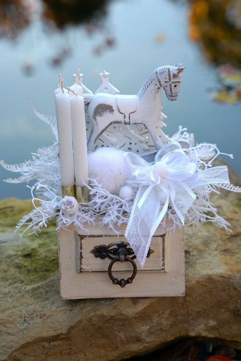 Adventní svícen v dřevěném šuplíčku v bílé barvě. Rozměr svícnu je 23x20x22cm