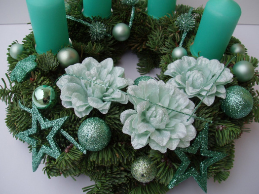 Adventní věnec z živého chvojí v barvě mentolově zelené.