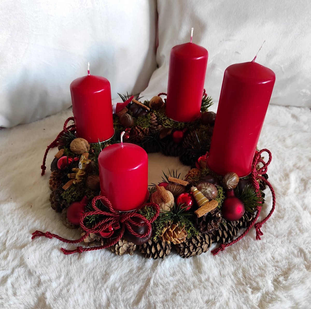 Adventní věnec do červeného ladění. Je zhotoven z různých druhů šišek, suchých plodů, umělých jehličnatých větviček a ze stabilizovaného dovozového mechu. Je ozdoben skleněnými skleněnými baňkami a dalšími přízdobami. Kvalitní svíčky jsou součástí dekorace. Věnec je opatřen 4 bodci na svíčky.