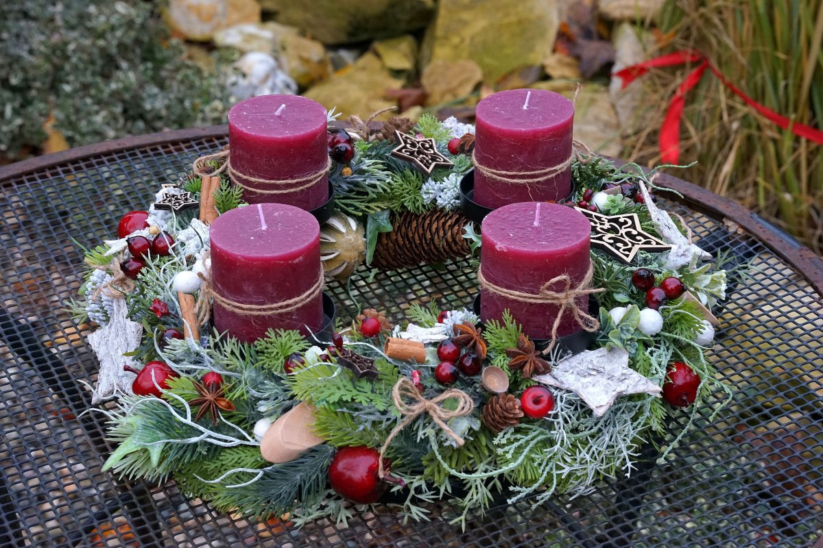 Adventní věnec v bordó barvě, umístěný na kovovém základu. Umělé chvojí ve 3D kvalitě, hvězdičky z kůry, jablíčka, dřevěné doplňky, skořice, limetky a další materiál.