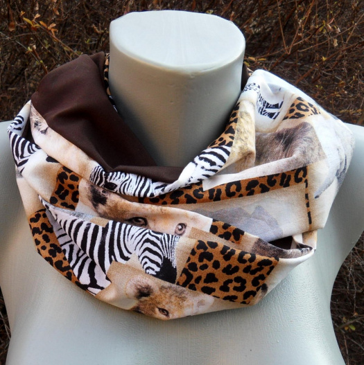 Je oboustranný, ušitý z krásného bavlněného popelínu se vzorem exotických zvířat, druhá strana je příjemný čokoládově hnědý viskozový úplet.