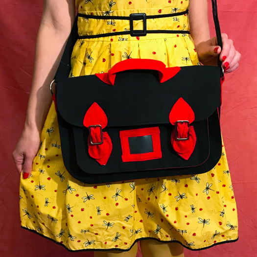 Černo-červená aktovka je zdobená kovovými přezkami.