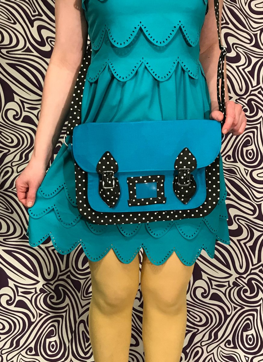 Modro-černo puntíkatá aktovka je zdobená kovovými přezkami...