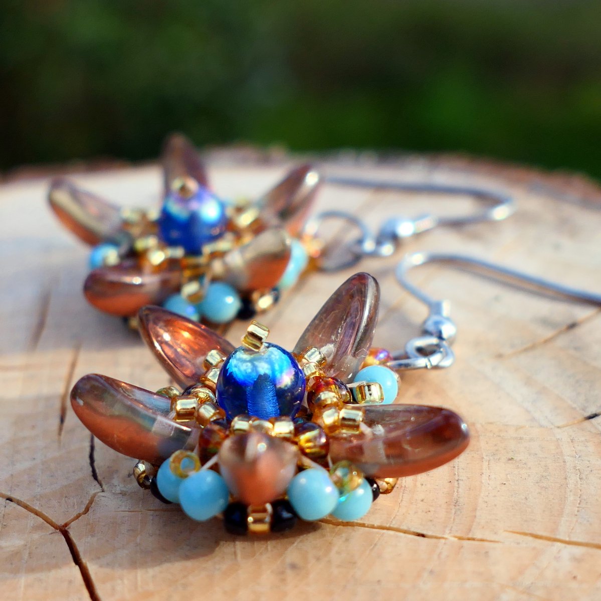 Ušito z mačkaných korálků a japonského rokailu, kombinace zlaté, měděné a modré.