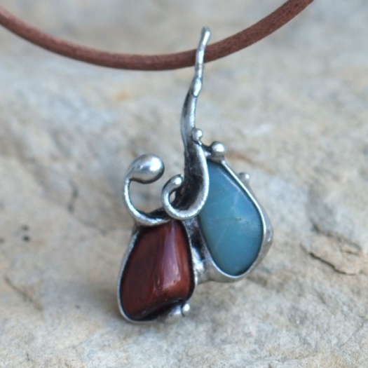 Cínovaný přívěsek s malým tromlovaným býčím okem a amazonitem. Zavěšeno na přírodní kůži o délce 45 cm,zakončené karabinkou a prodlužovacím řetízkem.