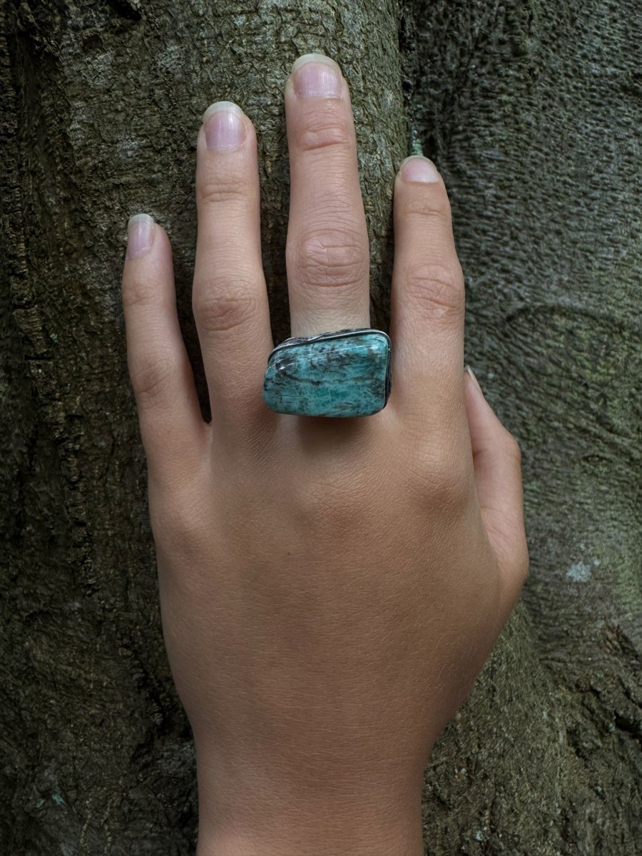 Prstýnek s kamenem AMAZONIT. Výrazná zelená barva a přitom stále působí na ruce jemně.