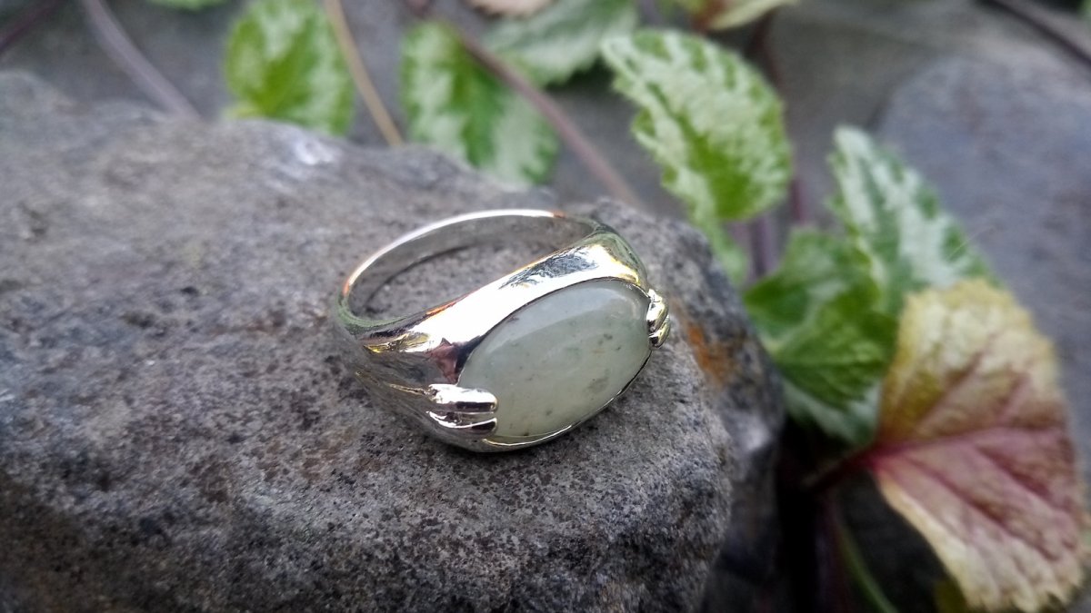 Prstýnek se zelenomodrým amazonitem z naleziště v Indii na zúžujícím kroužku nahoře o síle 10 mm dole 3 mm. Velikost kabošonu amazonitu 15x10 mm.