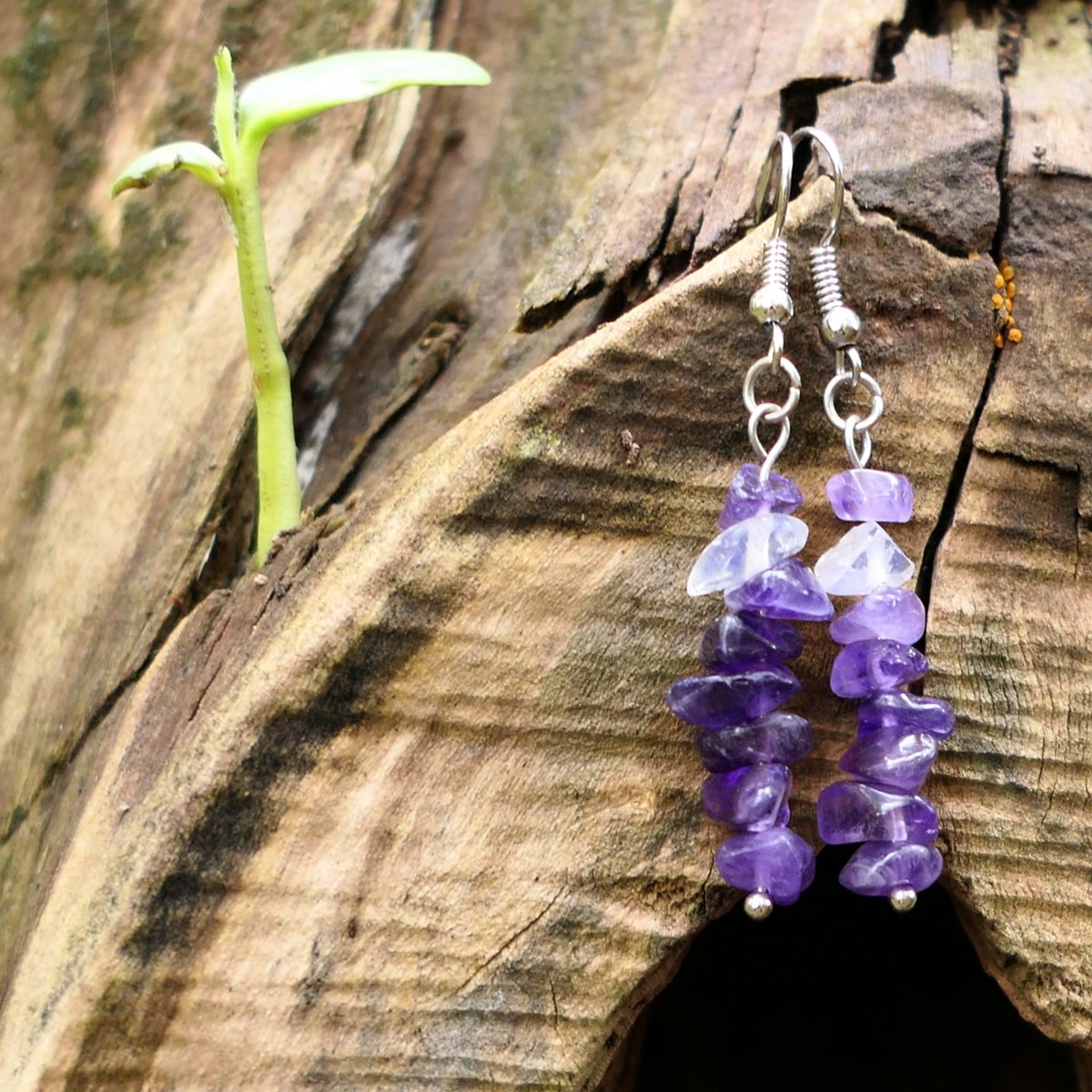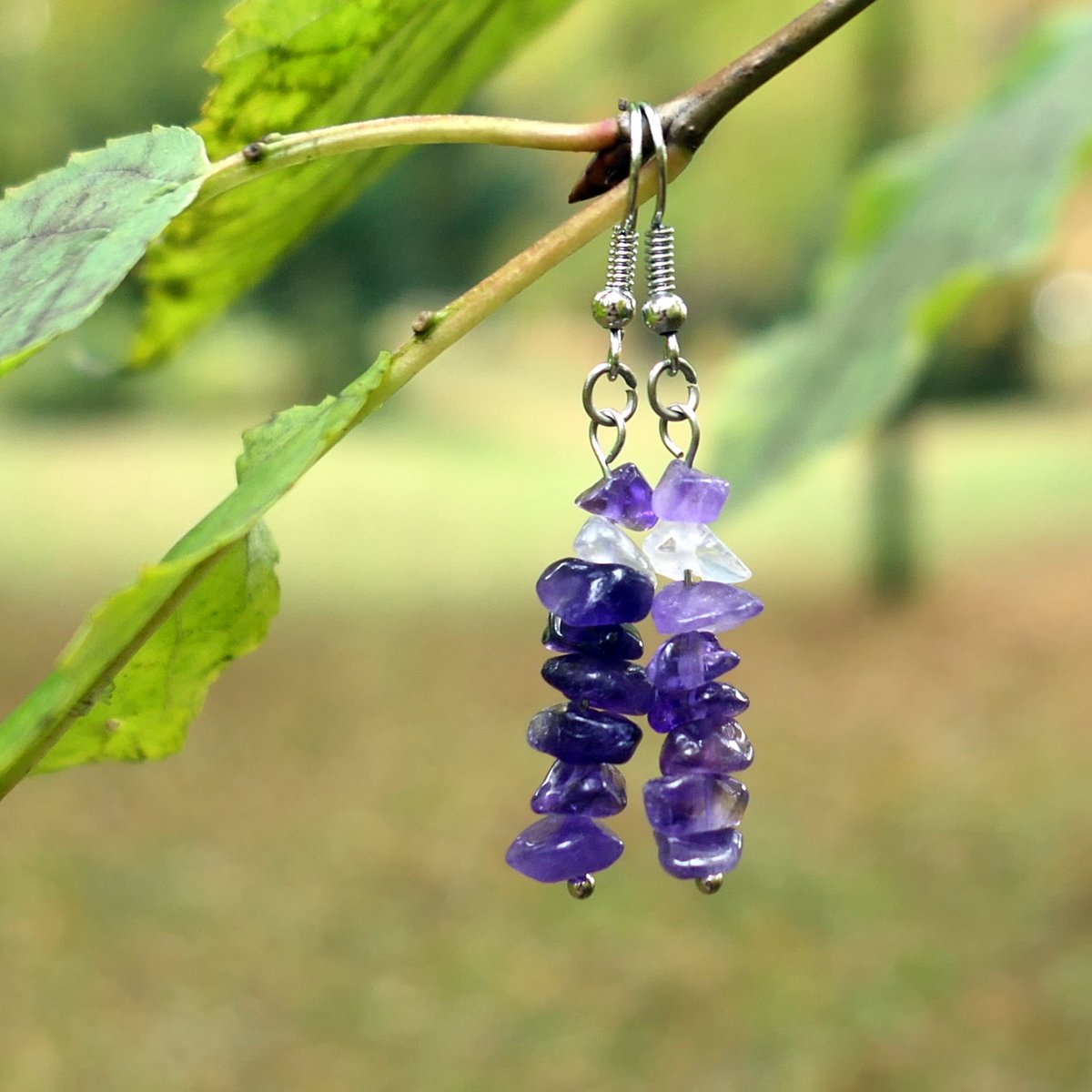 Minerální náušničky, zavěšené na otevřených háčcích z obecného kovu v platinové barvě, bez niklu. Výška 3 cm bez háčku.