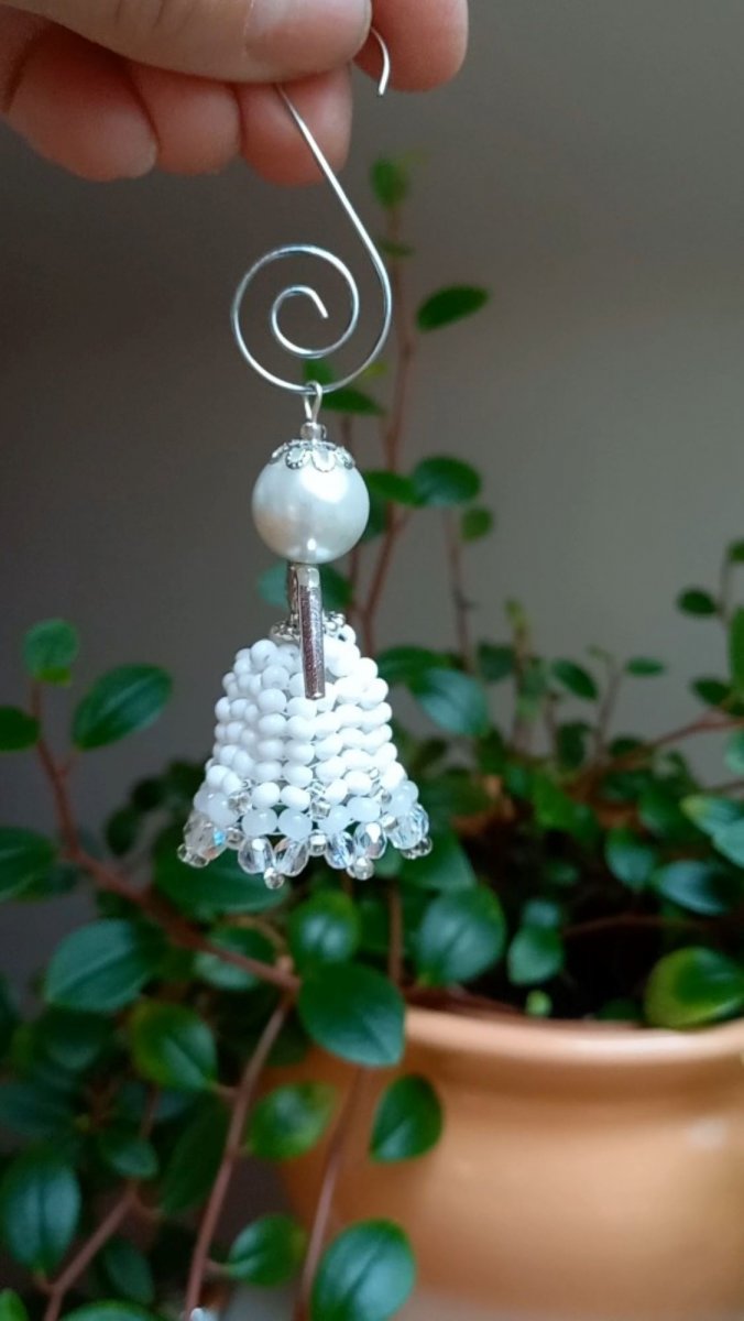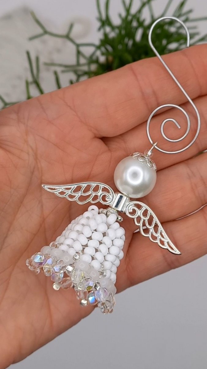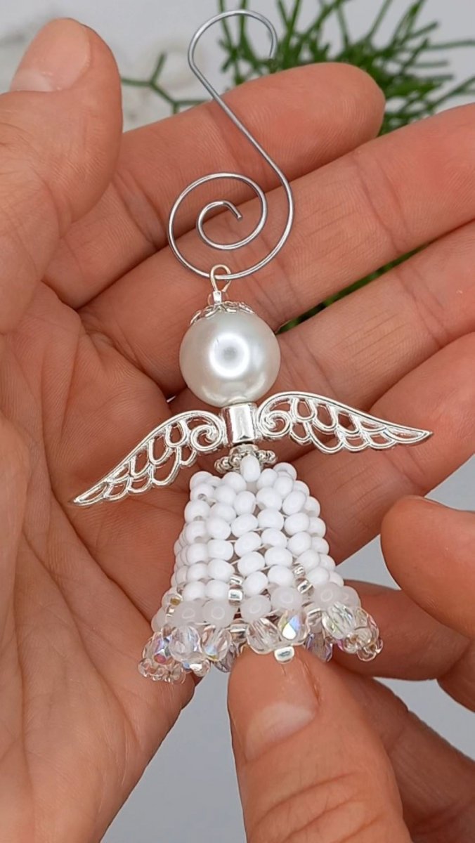 Elegantní andělíček z bílého a stříbrného rokajlu, vytvořený technikou beadweaving, je něžnou ozdobou pro vánoční stromeček, věnec nebo slavnostní stůl. Skleněné korálky a bižuterní komponenty dodávají jemný třpyt a slavnostní kouzlo.
