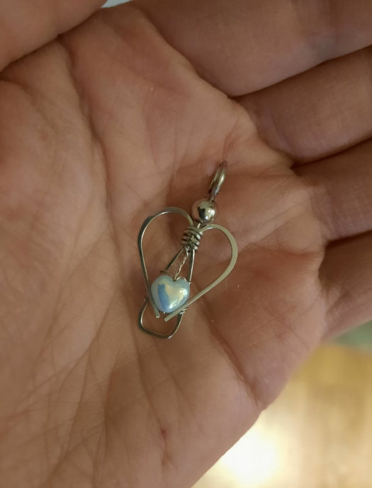 Přívěšek je ručně tepaný z chirurgické oceli s nebesky jemně modrým skleněným srdíčkem s lesklým pokoveným povrchem, české výroby.