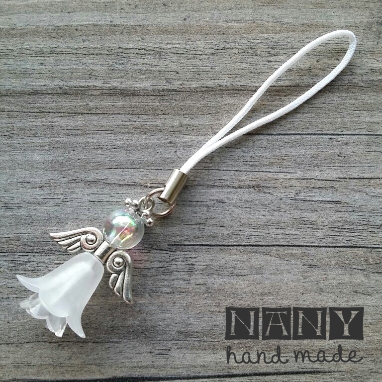 Stříbrné komponenty andělíčka jsou z kovových komponent v provedení stříbro antik, ostatní jsou z akrylu a korálků s pokovem.