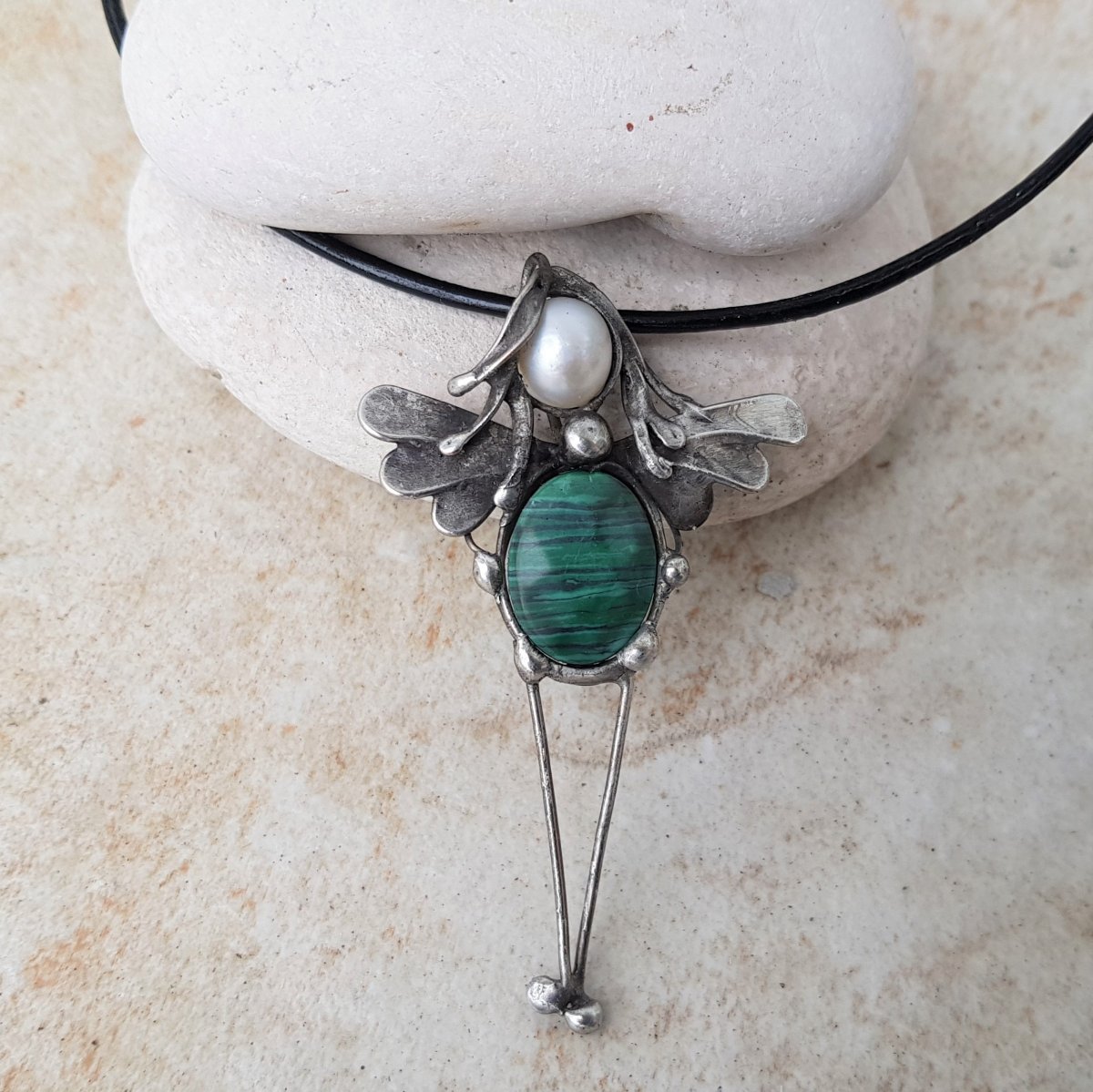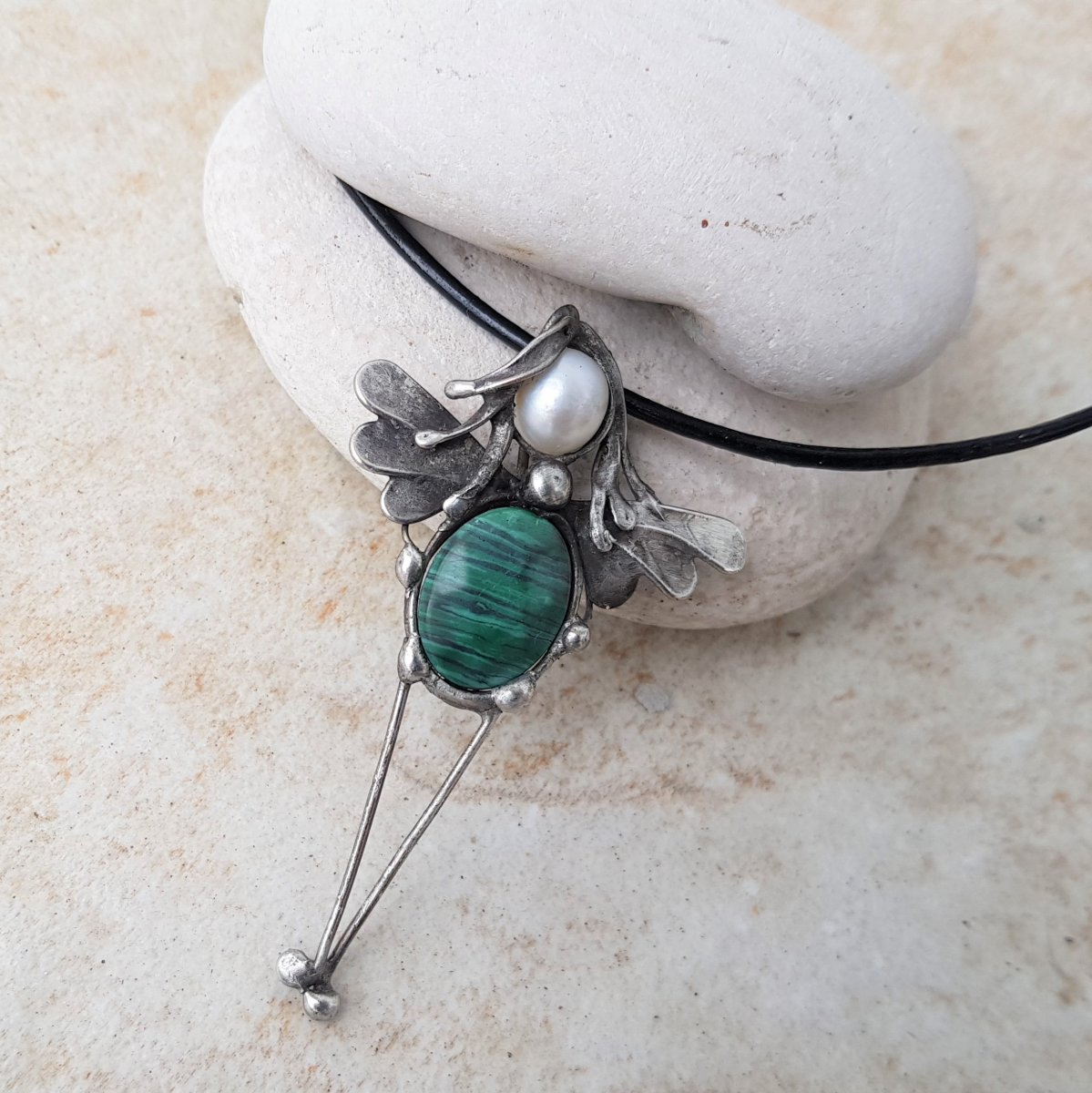 Ocínovaný, patinovaný náhrdelník Andělka technikou Tiffany z malachitu a říční perly, leštěný, ošetřený antioxidantem.