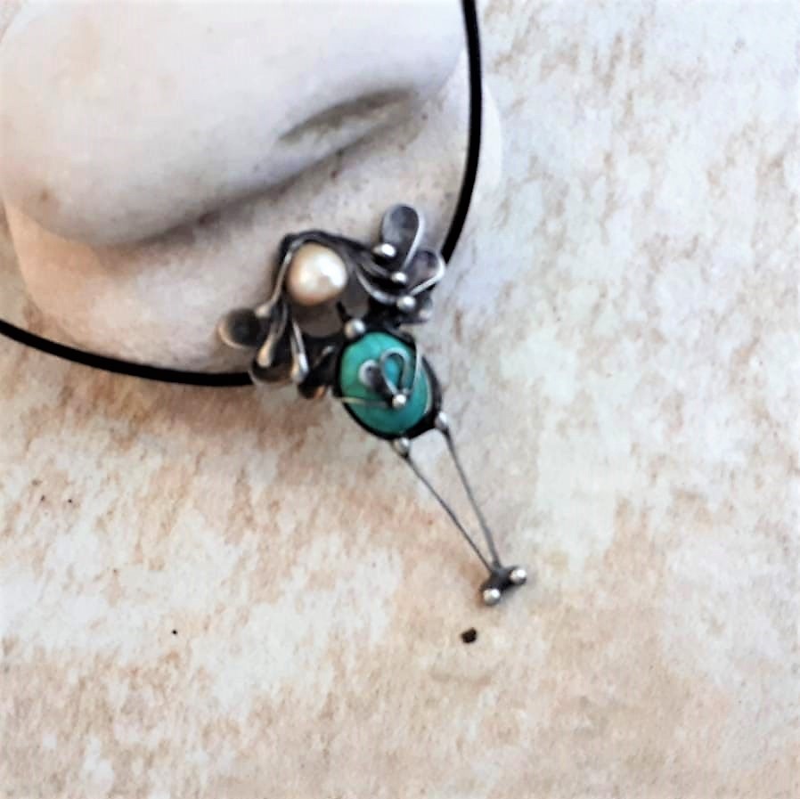 Cínovaný patinovaný náhrdelník - Andělka z tyrkenitu a říční perly
