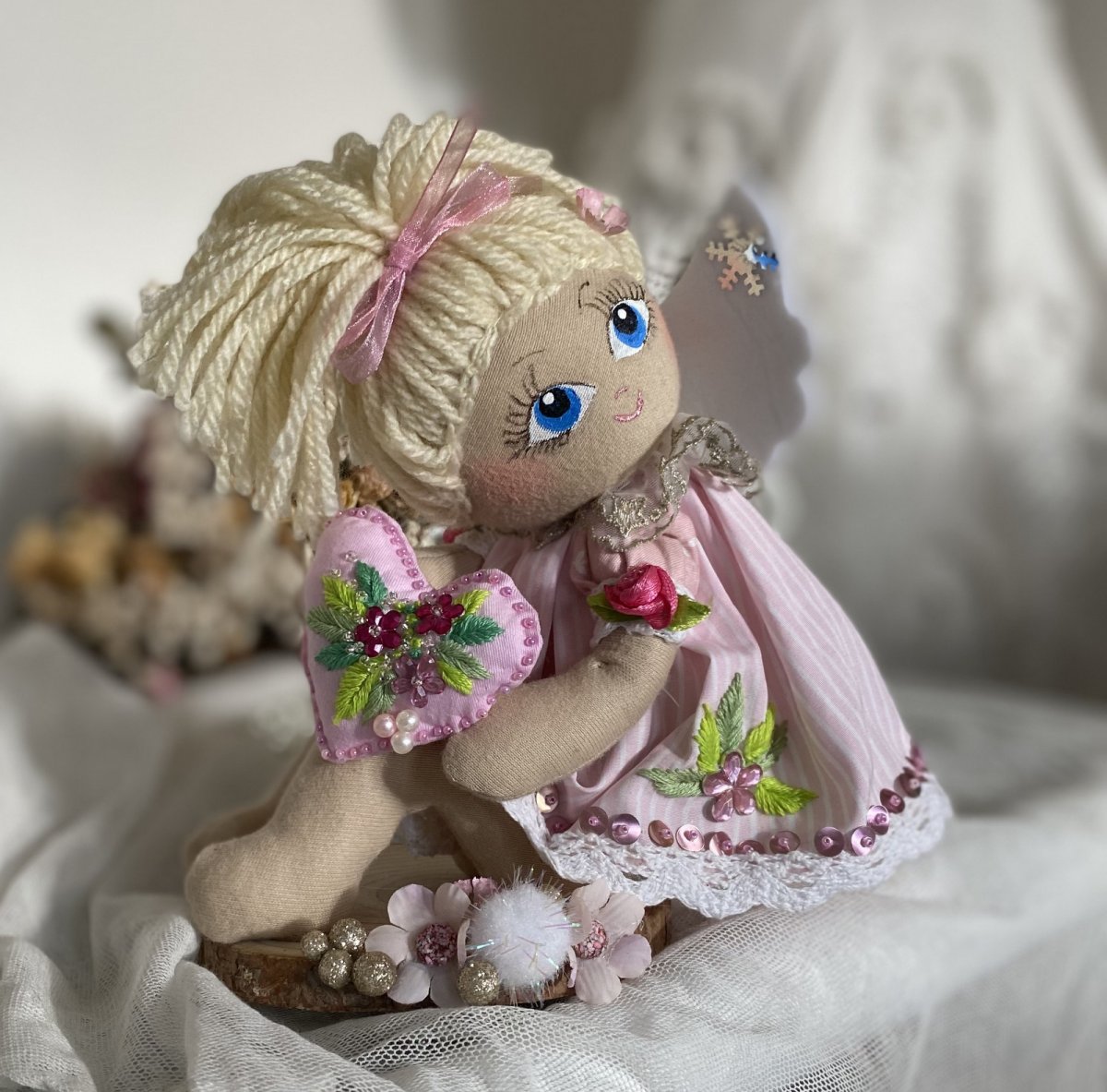 Andělka je ušita z bavlněného úpletu, obličejík ručně malovaný, vyšívané srdíčko drží v ručičkách.
