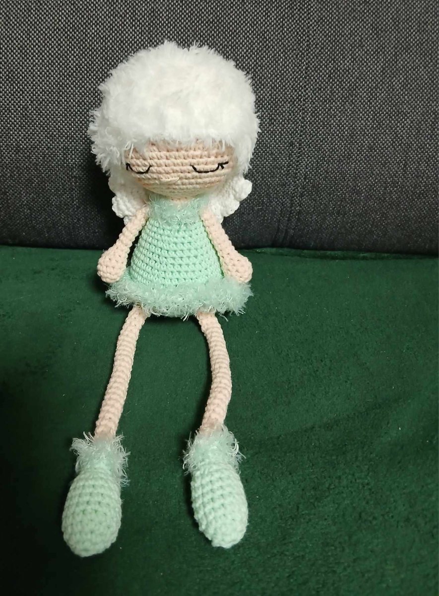 Háčkováno ze směsové příze bavna/akryl a vlásky z chlupaté příze polyamid), naplněné dutým vláknem.