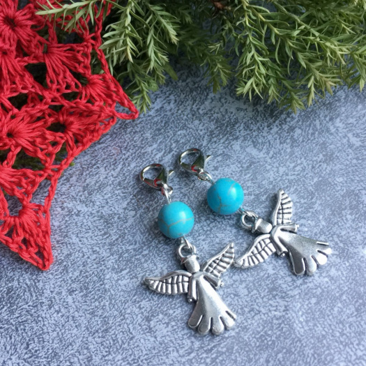 Přívěsek na kabelku, na bat'ůžek, na mobil nebo na klíče - andělka s kuličkou tyrkenitu (8 mm) a karabinkou. Délka andělky 2 cm, celková délka 4,5 cm