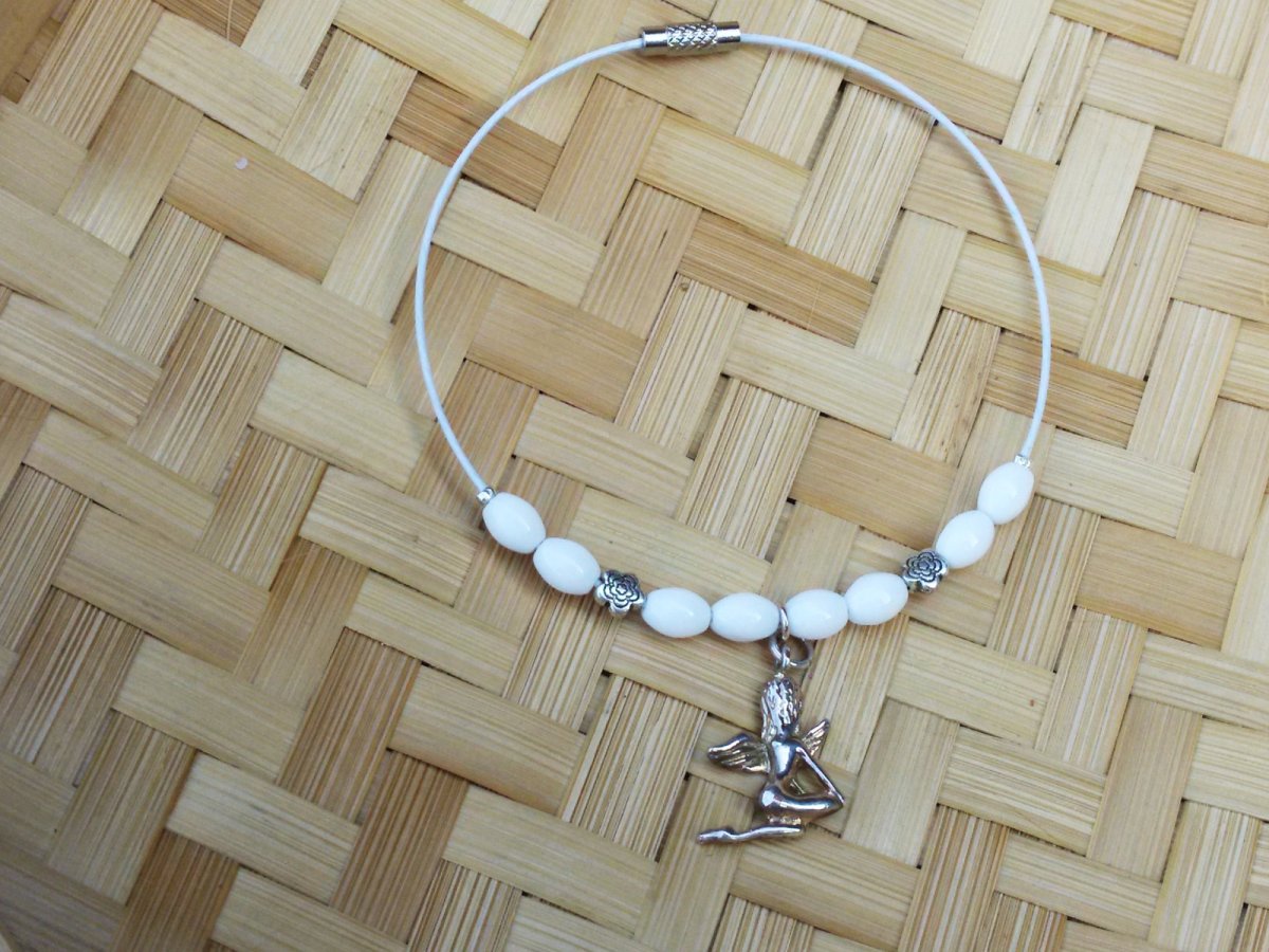 Dámský náramek je vyrobený z ocelového lanka,které je opatřené šroubovacím zapínáním.Toto lanko je potažené nylonem v bílé barvě