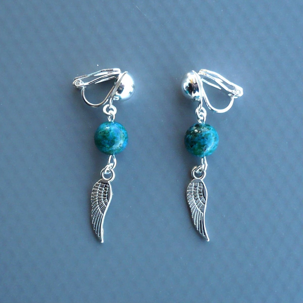 Minerální korálek chryzokol a přívěsek v podobě andělského křídla jsou zavěšeny na klipsovém zapínání - na toto zapínání není potřeba mít propíchnutá ouška. V případě zájmu přendám na zapínání pro propíchnutá ouška.