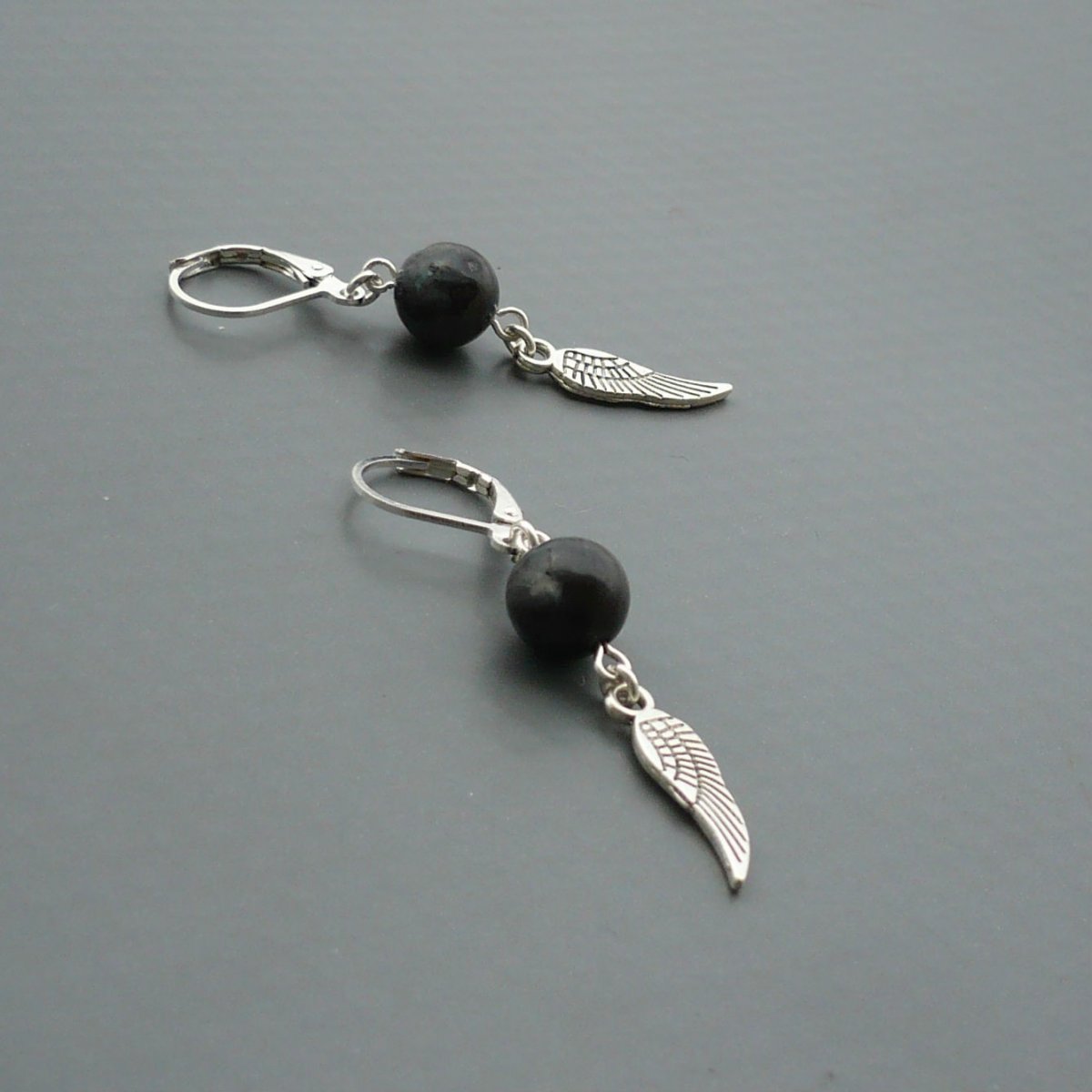 Minerální korálek z labradoritu a přívěsek v podobě andělského křídla jsou zavěšeny na oblíbeném uzavíratelném zapínání - tzv. klapce.
