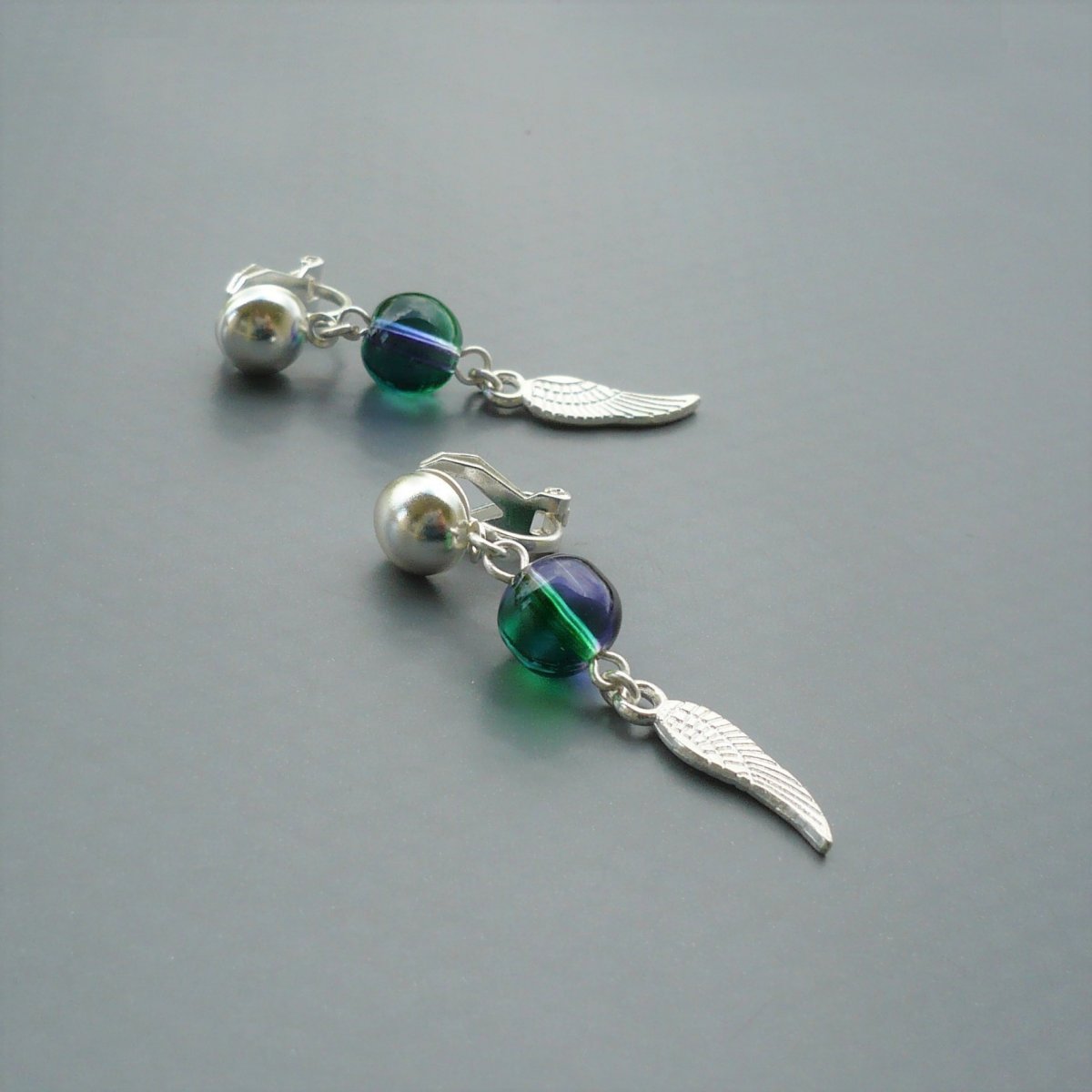 Modro-zelený korálek a přívěsek v podobě andělského křídla jsou zavěšeny na klipsovém zapínání - na toto zapínání není potřeba mít propíchnutá ouška. V případě zájmu přendám na zapínání pro propíchnutá ouška.