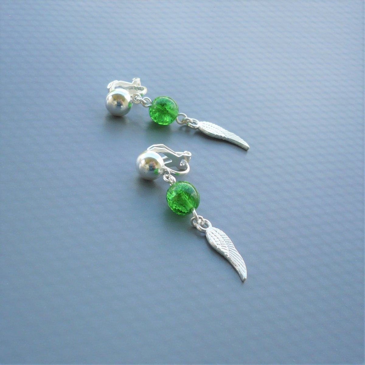 Zelený korálek s ozdobnou vnitřní popraskanou strukturou a přívěsek v podobě andělského křídla jsou zavěšeny na klipsovém zapínání - na toto zapínání není potřeba mít propíchnutá ouška. V případě zájmu přendám na zapínání pro propíchnutá ouška.
