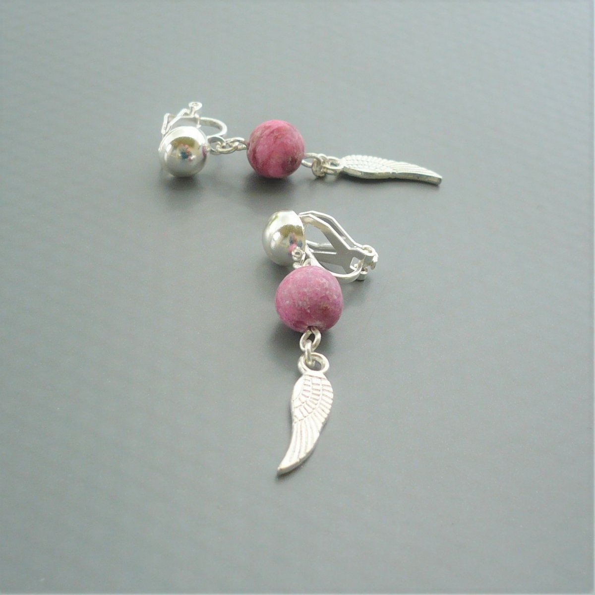 Minerální korálek z achátu růžové barvy v matném provedení a přívěsek v podobě andělského křídla jsou zavěšeny na klipsovém zapínání - na toto zapínání není potřeba mít propíchnutá ouška. V případě zájmu přendám na zapínání pro propíchnutá ouška.