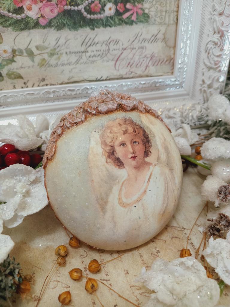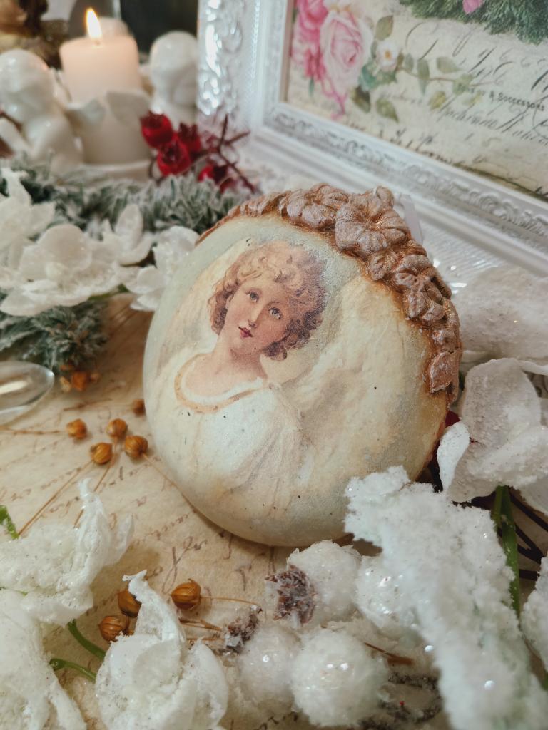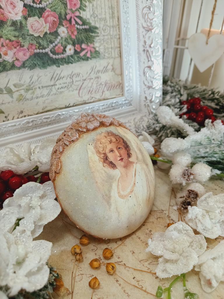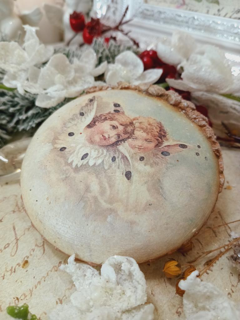 Vánoční ozdoba ve tveru medailonu s motivem andělů. Po obvodu je medailon zdobený jednoduše a pod očkem je vytvořená květinová bordura. Ozdoba je lehce patinovaná do vintage stylu.