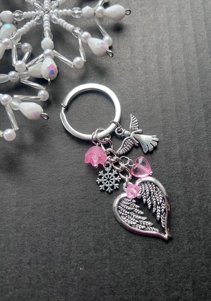 Střapec - přívěsek na kabelku, na bat'ůžek, na mobil nebo na klíče s andělkou, vločkou, andělskými křídly a korálky na kroužku s řetízkem. Délka včetně kroužku 9 cm, kroužek 3 cm