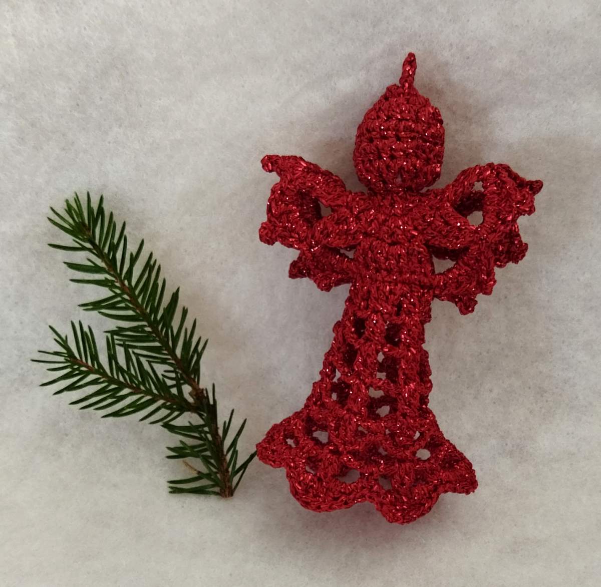 Andílek je uháčkovaný z vysoce kvalitní metalizované červené efektní příze německé výroby. Je pečlivě naškrobený, aby krásně držel tvar. Jeho výška je cca 9cm. Skvěle se hodí jako ozdoba na vánoční stromeček, věnec nebo jako přízdoba k dárkům. Nebo ho můžeme postavit volně na vánoční stůl nebo okno. Fantazii se meze nekladou.