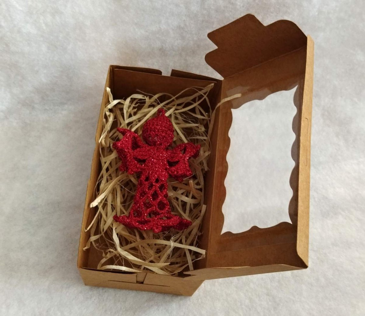 Andílek je uháčkovaný z vysoce kvalitní metalizované červené efektní příze německé výroby. Je pečlivě naškrobený, aby krásně držel tvar. Jeho výška je cca 9cm. Skvěle se hodí jako ozdoba na vánoční stromeček, věnec nebo jako přízdoba k dárkům. Nebo ho můžeme postavit volně na vánoční stůl nebo okno. Fantazii se meze nekladou.