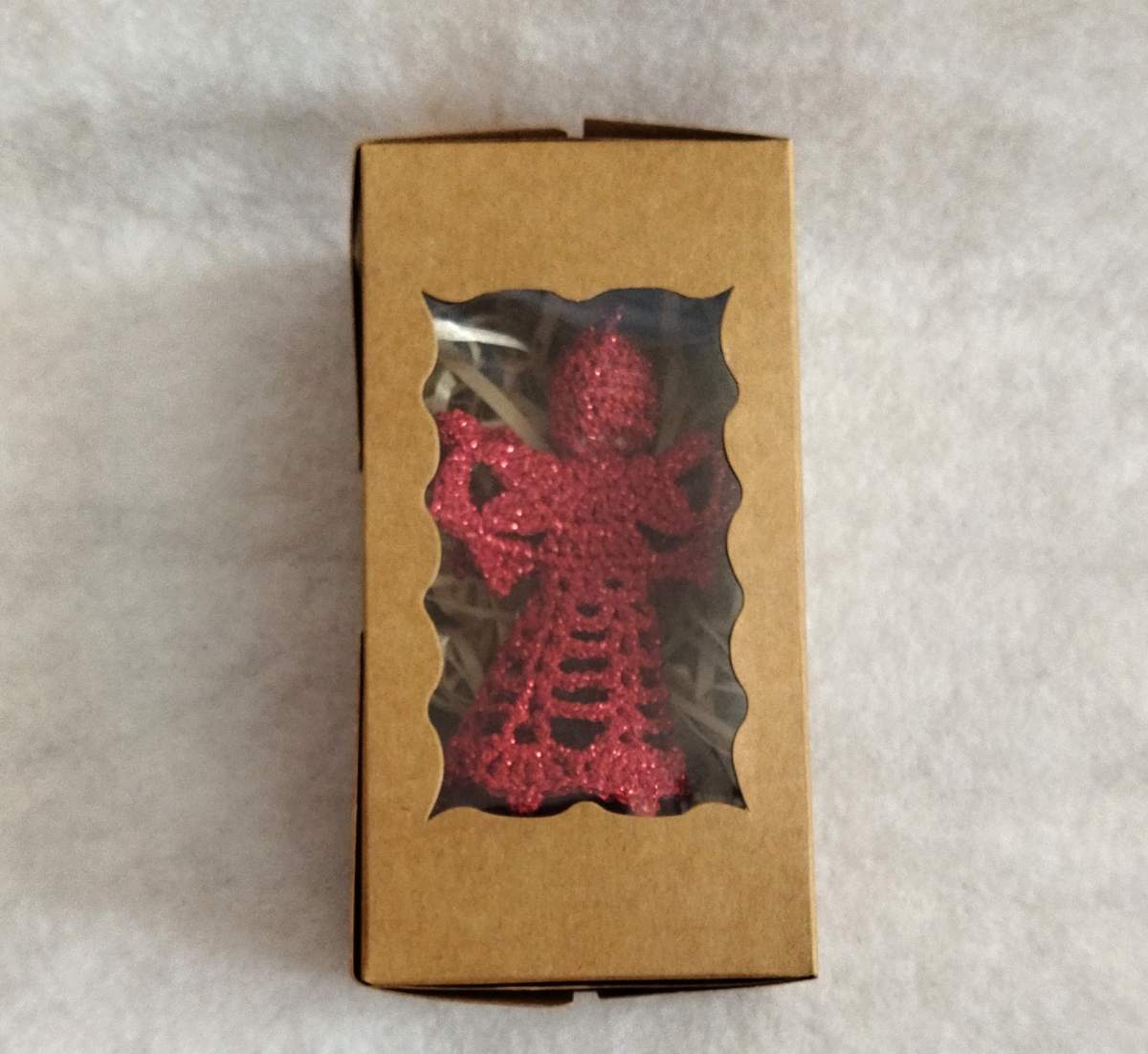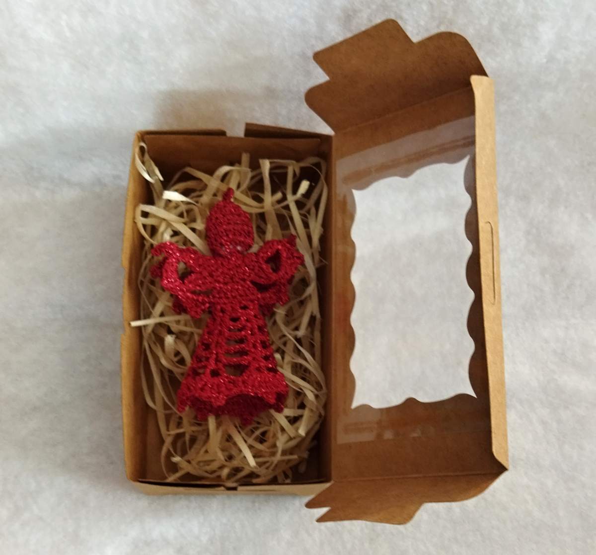 Andílek je uháčkovaný z vysoce kvalitní metalizované červené efektní příze německé výroby. Je pečlivě naškrobený, aby krásně držel tvar. Jeho výška je cca 9cm. Skvěle se hodí jako ozdoba na vánoční stromeček, věnec nebo jako přízdoba k dárkům. Nebo ho můžeme postavit volně na vánoční stůl nebo okno. Fantazii se meze nekladou.