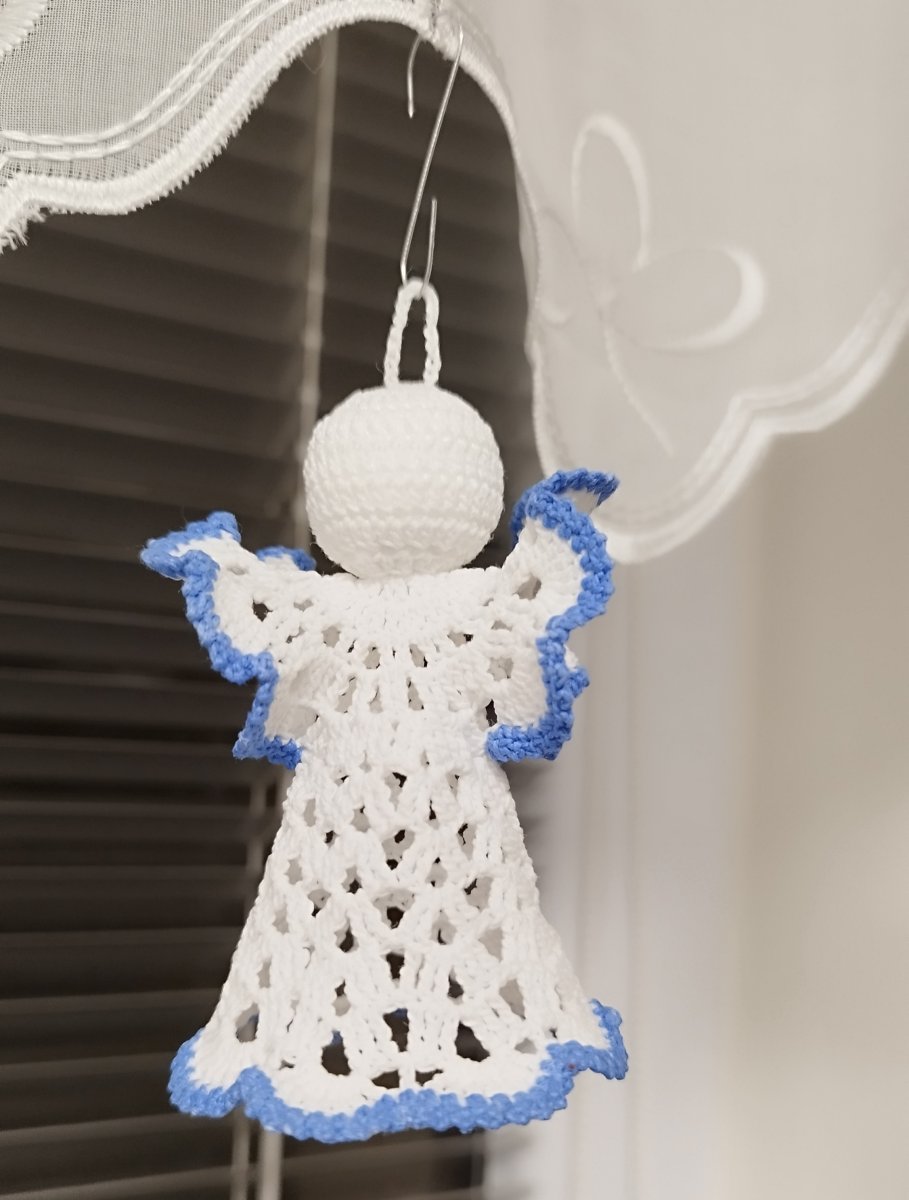 Ručně háčkovaný andílek, bílá barva, modrý lem,