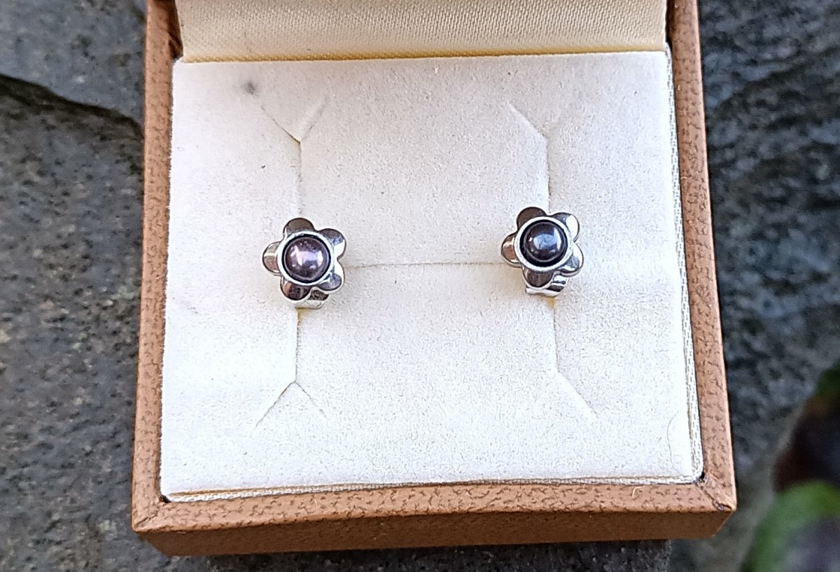 Něžné romantické náušnice puzety ve tvaru drobných květinek zdobených uprostřed antracitovými dokonale lesklými říčními perličkami o průměru 3 mm. Květinky jsou vyrobené z chirurgické oceli - hypoalergenní, vhodné i pro alergiky. Průměr květinky 7 mm.