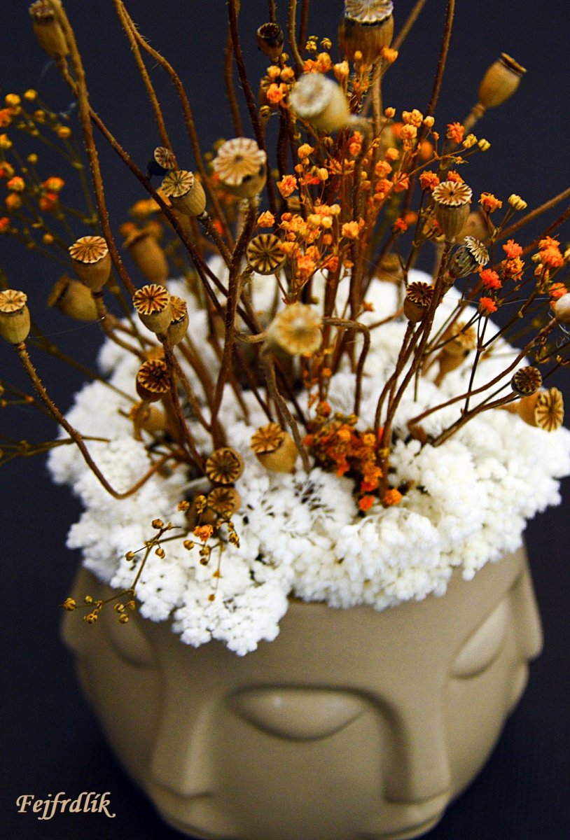 Originální aranžmá v keramické ,,hlavě- obličej ze všech stran ;-), se stabilizovanou bělenou Achilleou , sušenými makovičkami a stabilizovanou Gypsophilou.