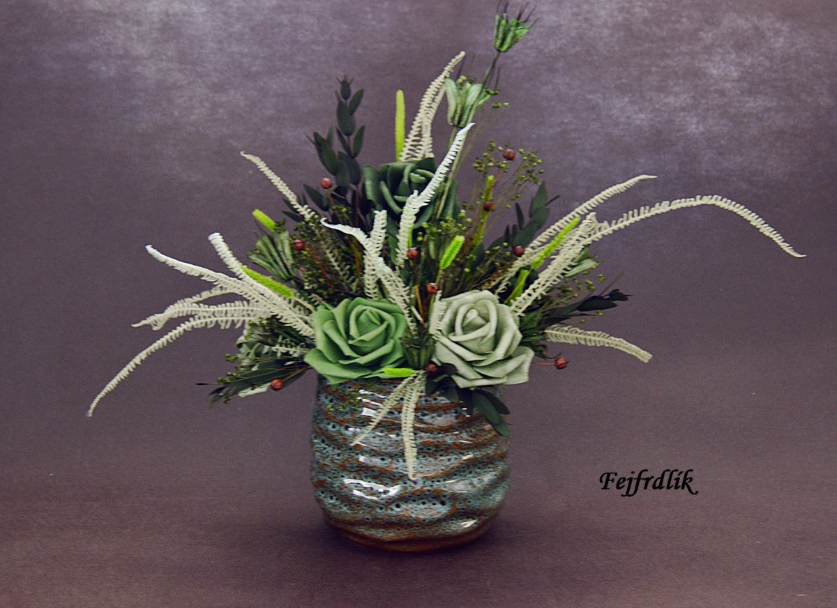Originální aranžmá v keramickém zdobeném obalu se stabilizovanou a ost. sušinou a pěnovými růžemi.