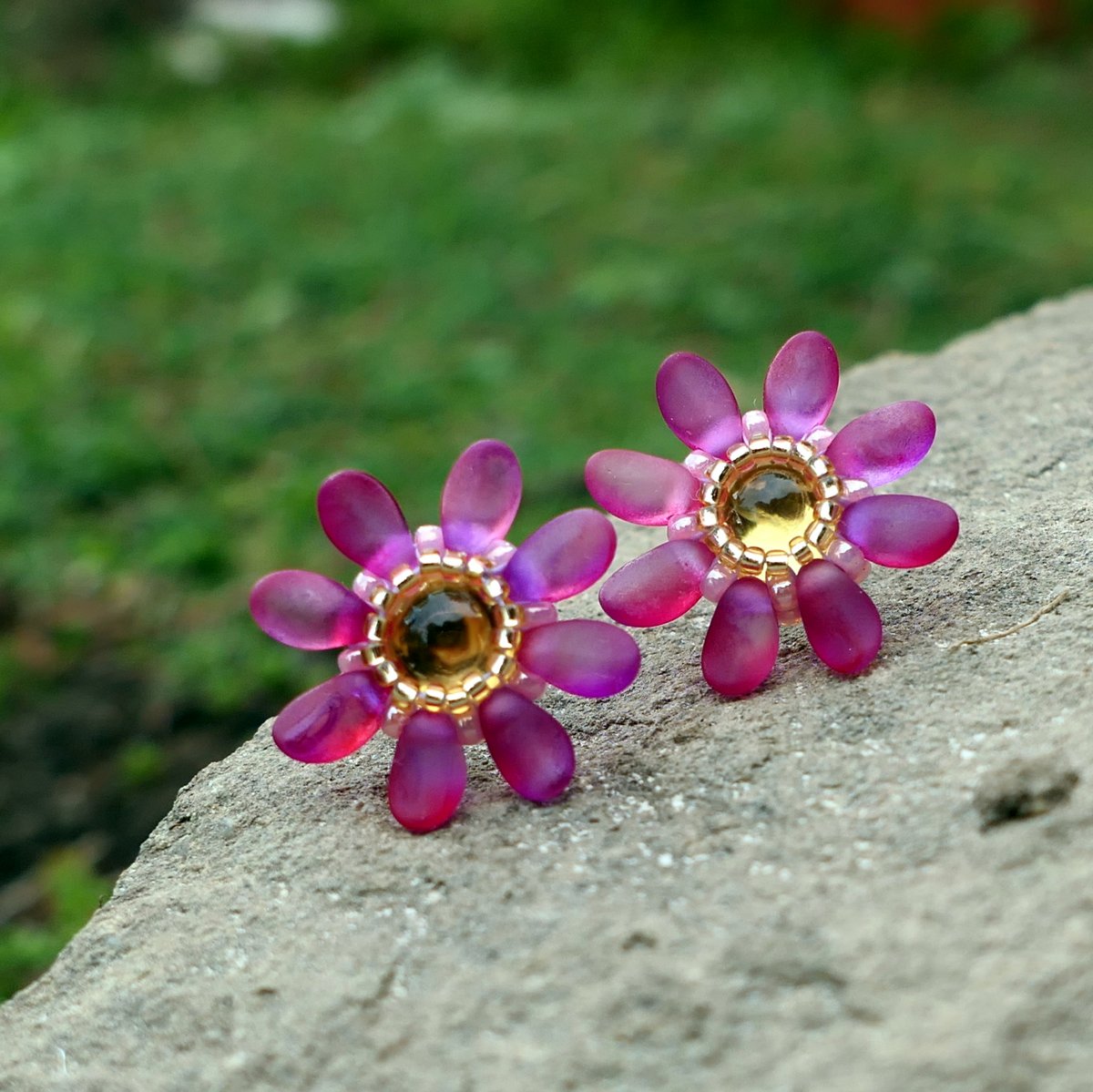 Mačkané skleněné korálky s japonským rokailem Toho v růžové a zlaté barvě, uprostřed skleněný kabošonek v průzračné světle žluté barvě.