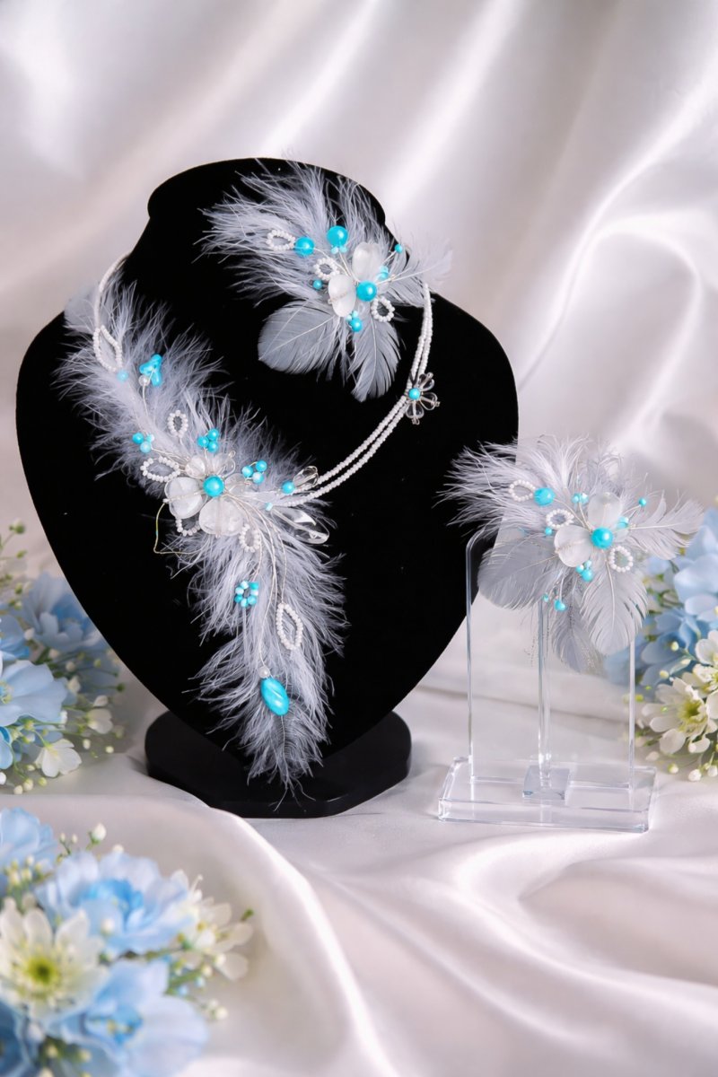 Tento autorský svatební set tvořený výrazným náhrdelníkem a jemnou ozdobou do vlasů je navržen pro nevěsty, které hledají originální, lehký a přitom nepřehlédnutelný šperk. Kombinace peří, perliček, skleněných korálků a tyrkysových detailů vytváří vzdušný a romantický vzhled, který krásně vynikne na nevěstě, doplněk k plesovým šatům i na svatebních fotografiích.