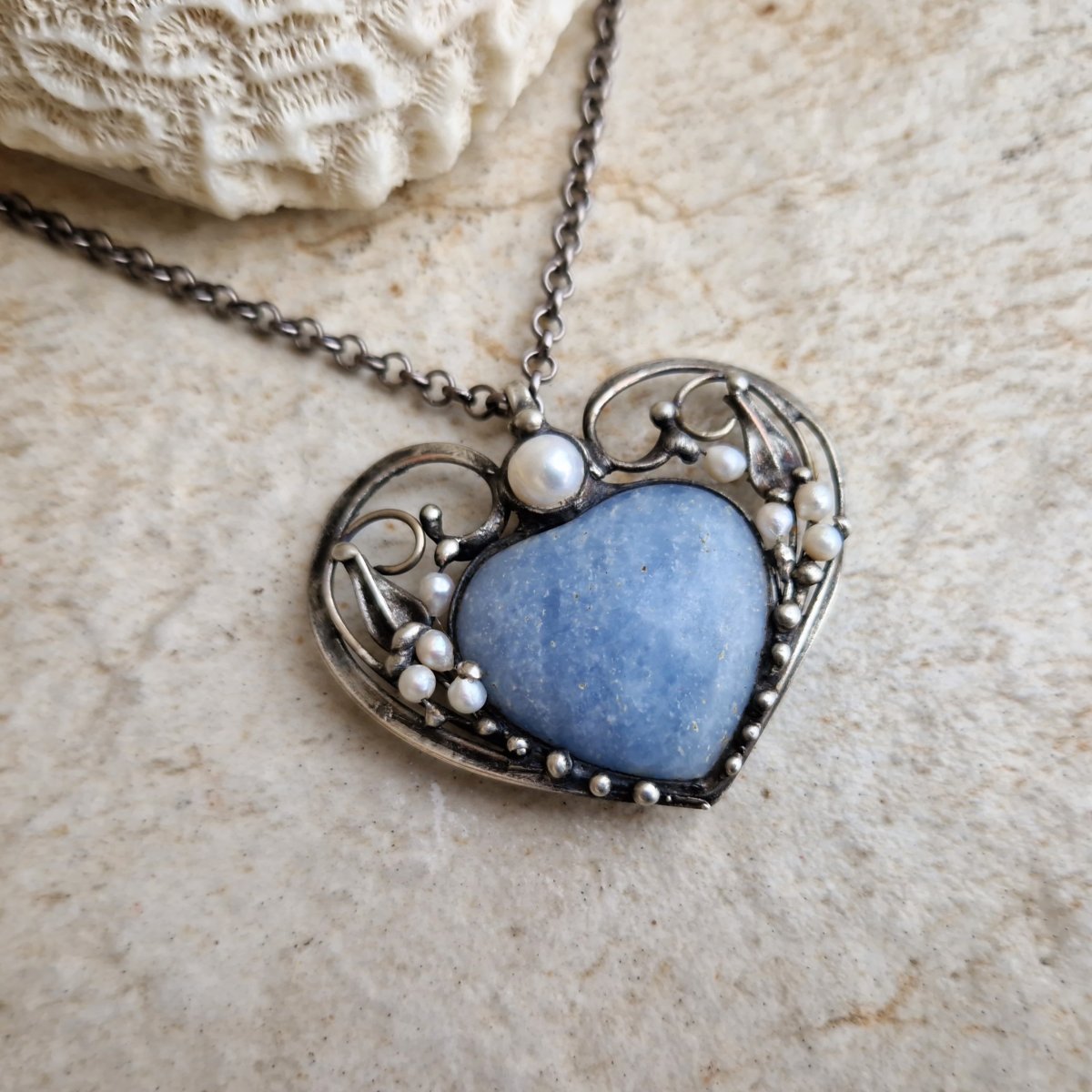Cínovaný, patinovaný, následně leštený náhrdelník z krásně opracovaného angelitu do tvaru srdce a korálků z říčních perel . Náhrdelník je patinovaný, následně leštěný a ošetřený antioxidačním přípravkem.