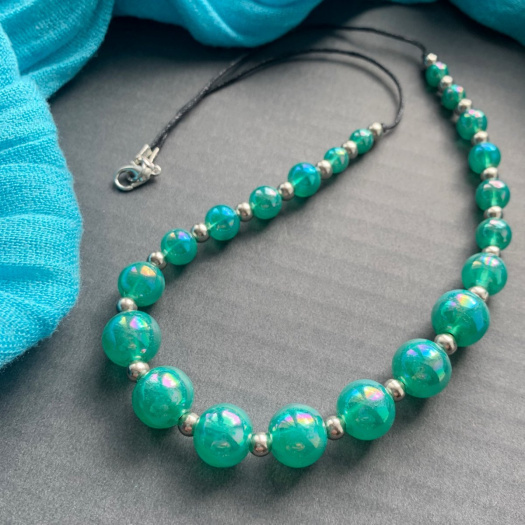 Náhrdelník s azurovými skleněnými korálkami a drobnějšími stříbrnými kuličkami - navlečeno na černé voskované šňůrce, zapínání na karabinku v barvě stříbra (bižuterní kov). Délka cca 50 cm