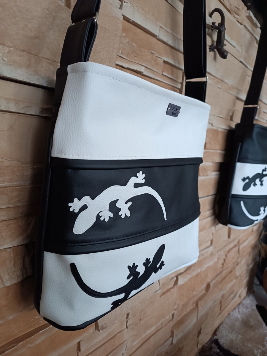 Originální, sportovně-elegantní černo-bilá kabelka s aplikací černé a bílé ještěrky.