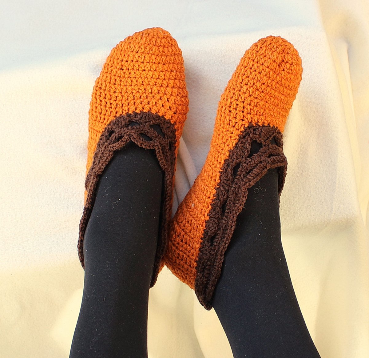 Háčkované jednoduché přezůvky v barvě rezavé, lemované čokoládově hnědou.