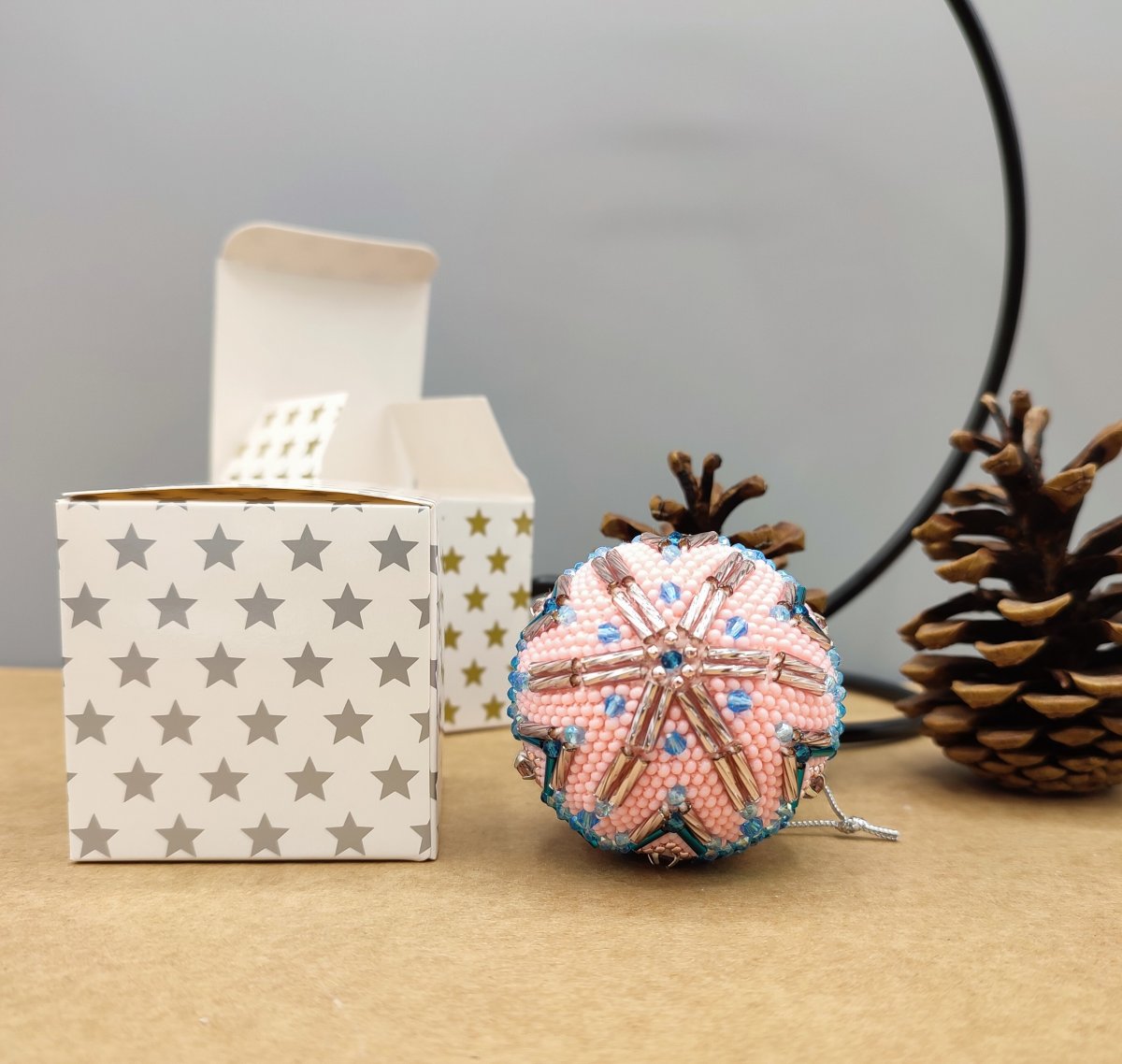 Baňka na vánoční stromeček háčkovaná z rokajlových korálků s velmi složitým vzorem.