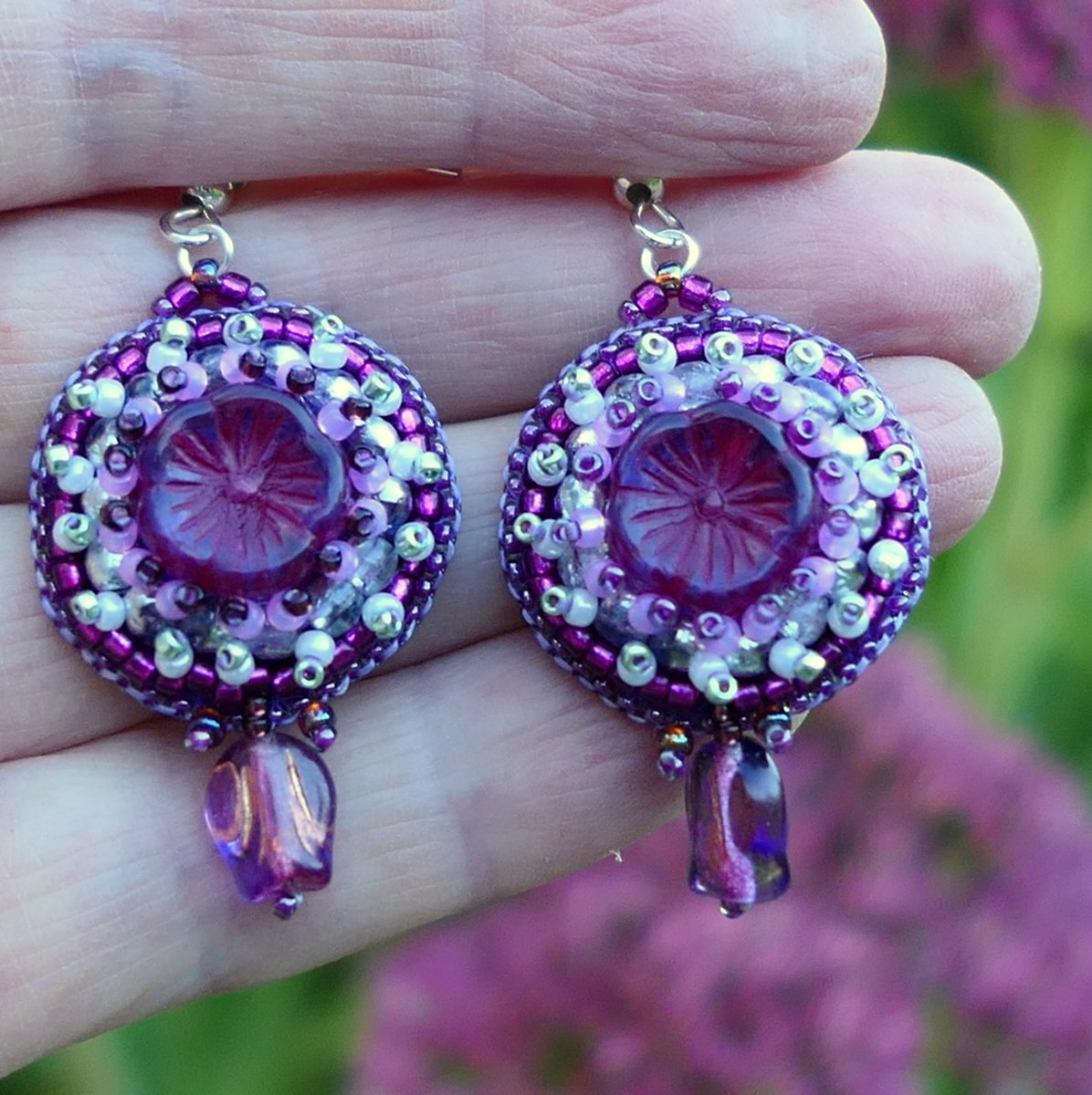 Skleněné kytičky, obšité japonským rokailem, mačkanými kuličkami v růžové, stříbrné, bílé a zelené, se skleněným tulipánkem. Podšité šedou Alcantarou (semiši podobná látka).