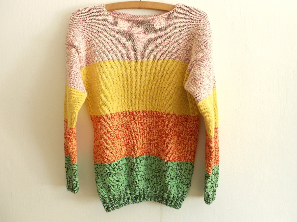 Dámský ručně pletený, melírovaný, pružný svetřík nebo halenka. Velikost M,L: délka 62 cm, šířka 47 cm, vnitřní délka rukávu 46 cm. 50% bavlna + 50% akryl. Doporučuji jemné praní, možno i v pračce a sušit volně položené.