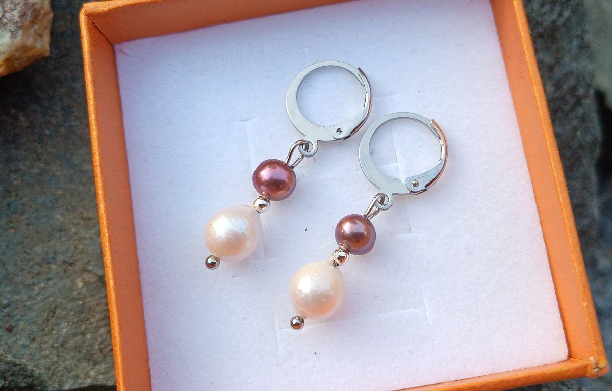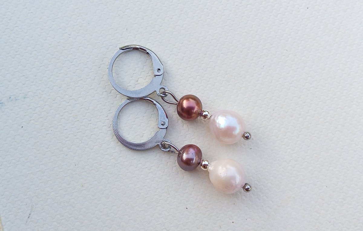 Náušnice z prvotřídních dokonale lesklých říčních barokních perel o velikosti cca 9 mm zavěšených pod drobnou hnědými mořskými perlami s průměrem 5 mm na zavíracích háčcích z chirurgické oceli - hypoalergenní, vhodné i pro alergiky.